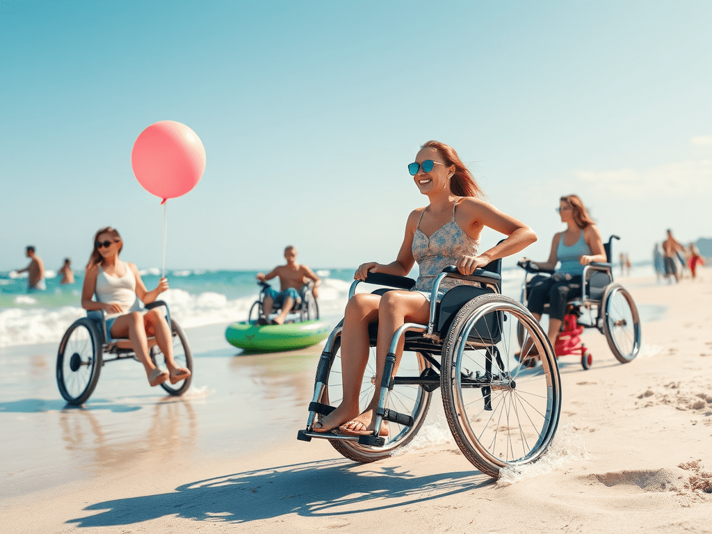 - Balloon-wheel chairs: Big, soft tyres that float over sand without sinking. Great for dry beaches and gentle slopes.